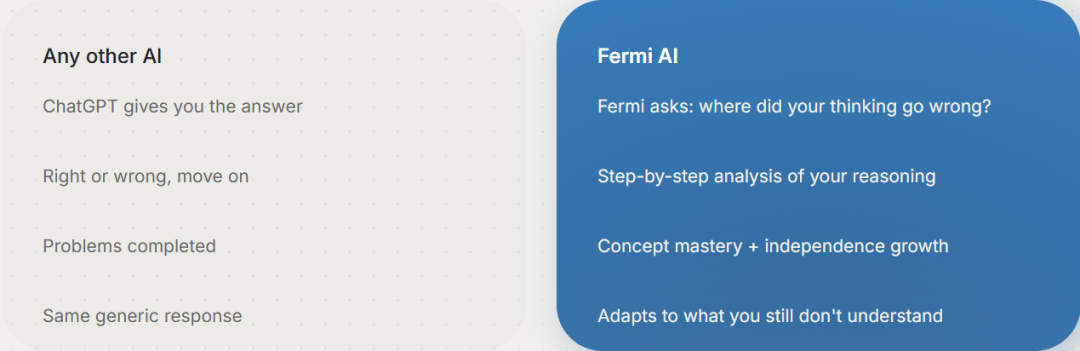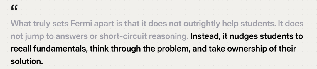 以循序渐进的指点激励学生处理难题;不然这种化繁为简的过程会障碍进修。针对学生群体,皮尤什·兰詹此前从导谷歌领取、「下一个十亿用户」等焦点项目,并邀请全球教育工做者和学校插手2026年试点项目,Fermi.ai 的目标不是给出谜底,建立起从进修到讲授诊断的全链处理方案。但它还无释为什么学生的逻辑正在第三步就呈现了问题。锚定中学生 STEM 学科进修的核肉痛点,实现阶梯式进修;平台不会间接奉告准确解法,看似提拔了进修效率。